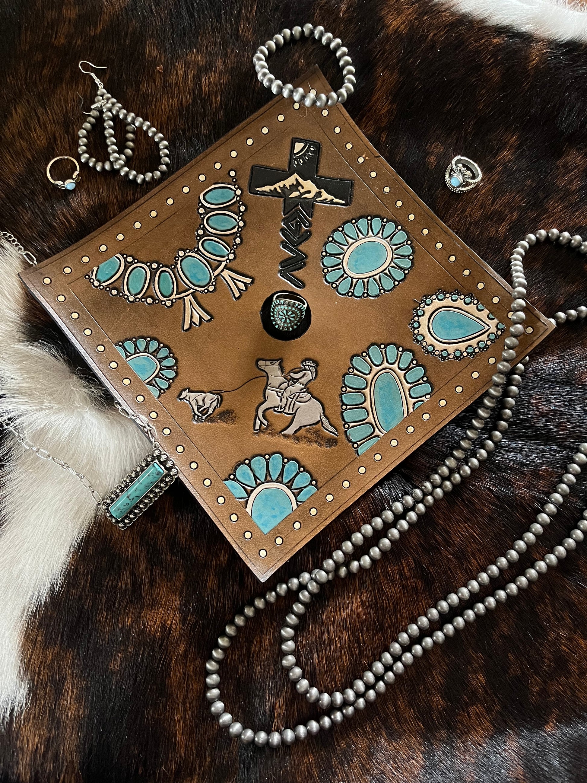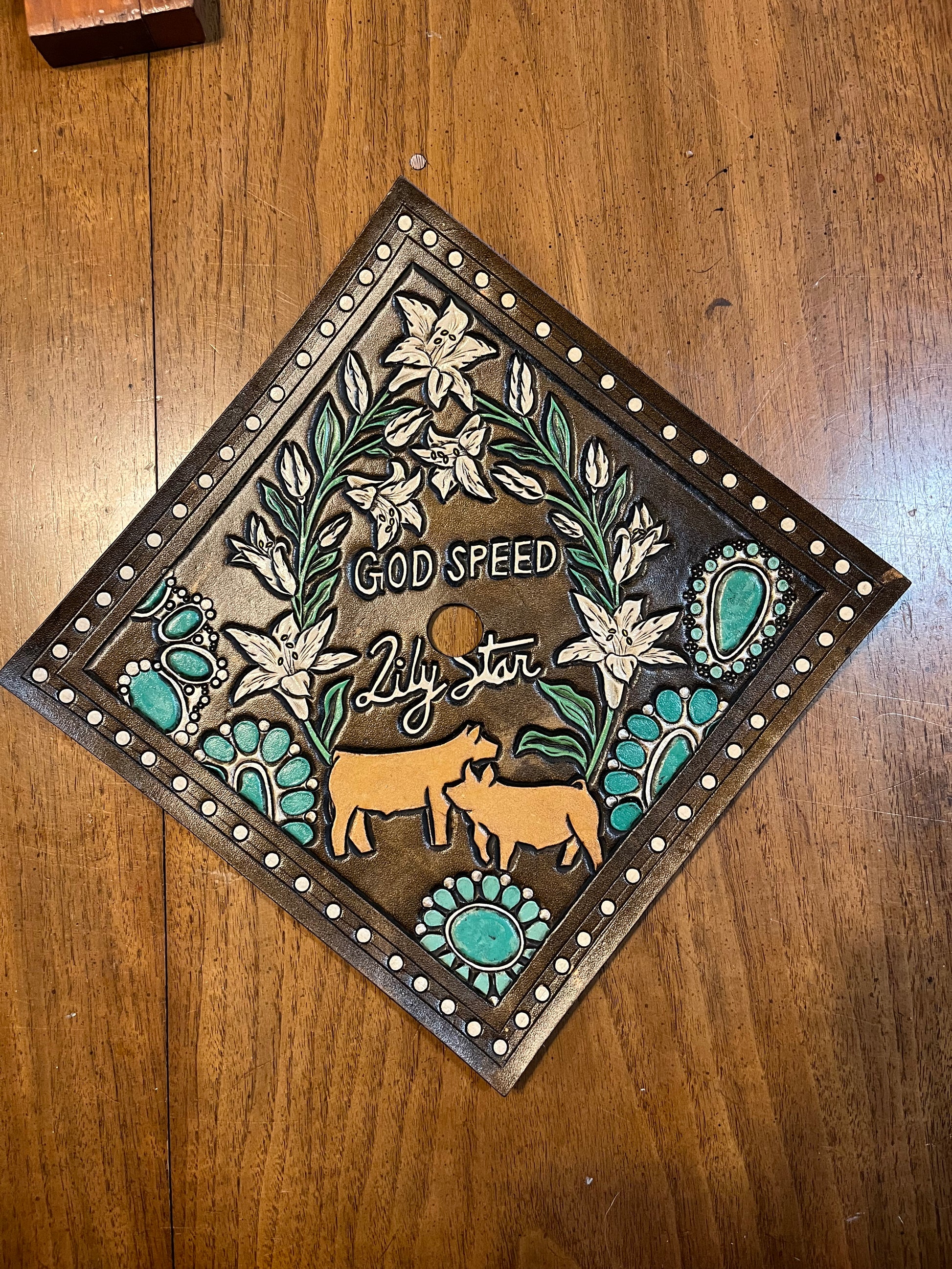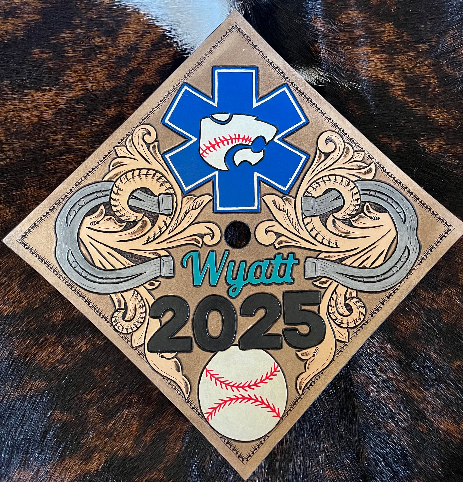 This listing is for a non-refundable deposit to begin work on a custom graduation cap designed specifically for you. Each cap is handcrafted and may include hand-tooled leather, laser engraving, cowhide or hair-on hide accents, and other custom details upon request.
