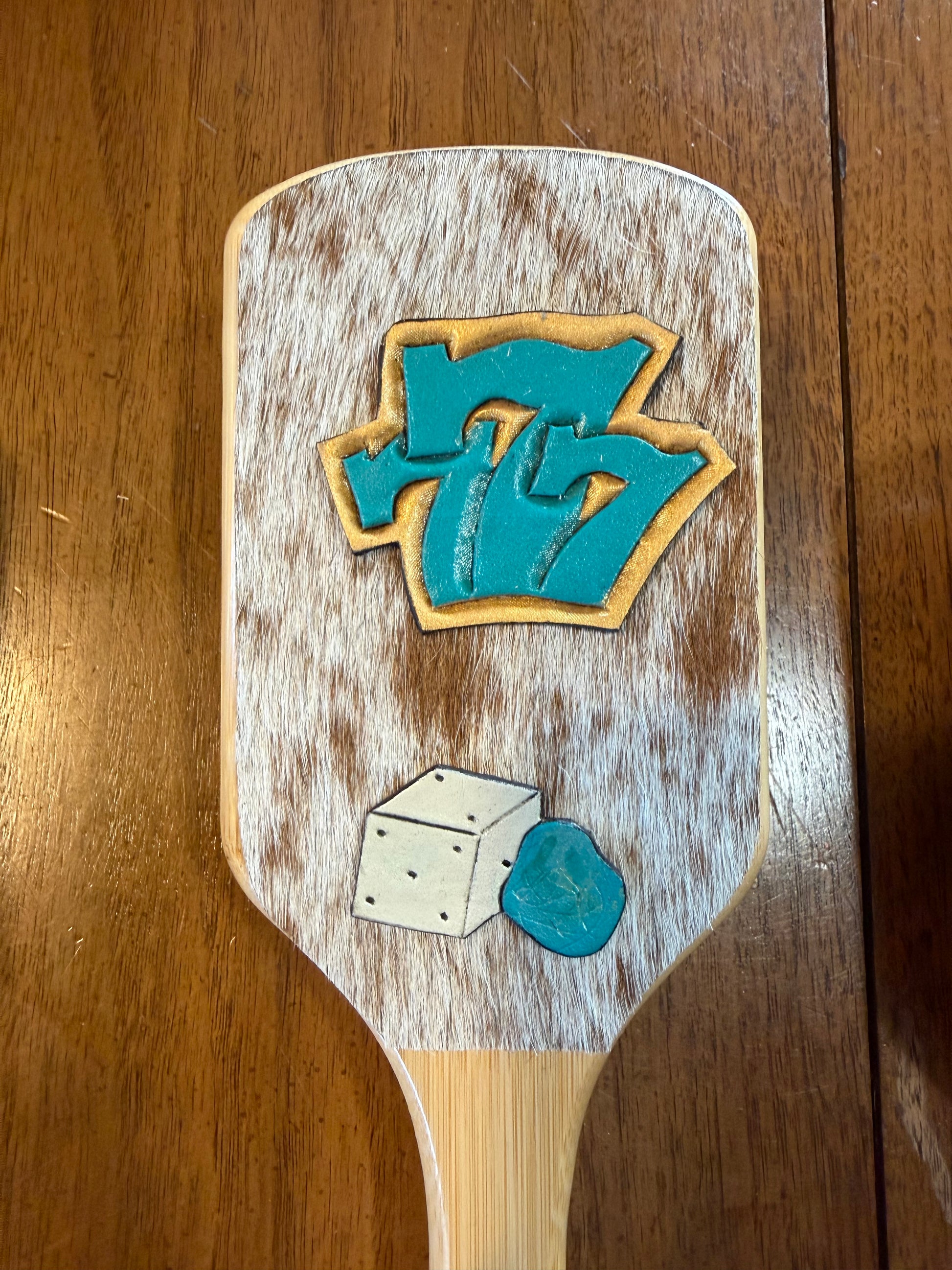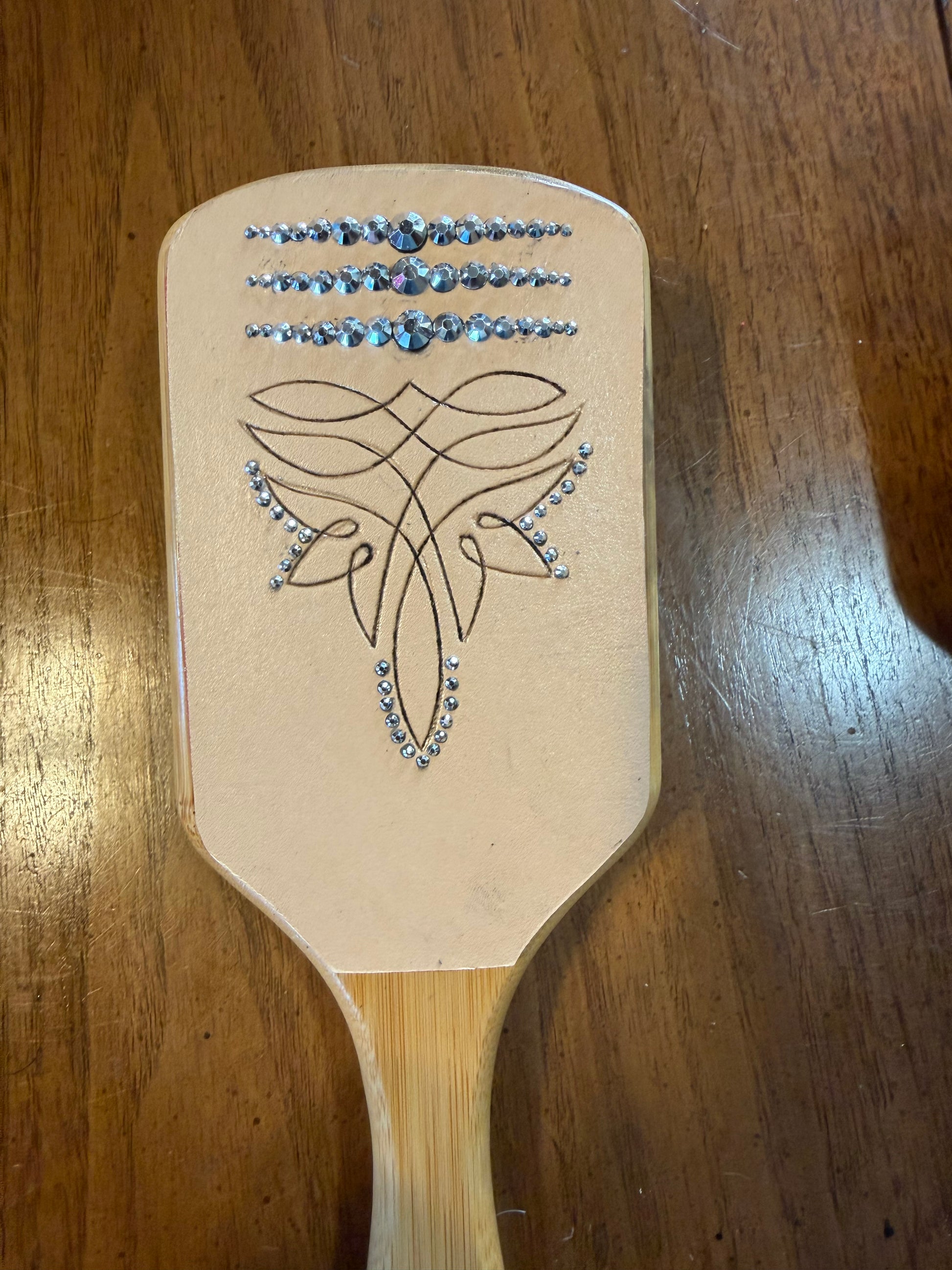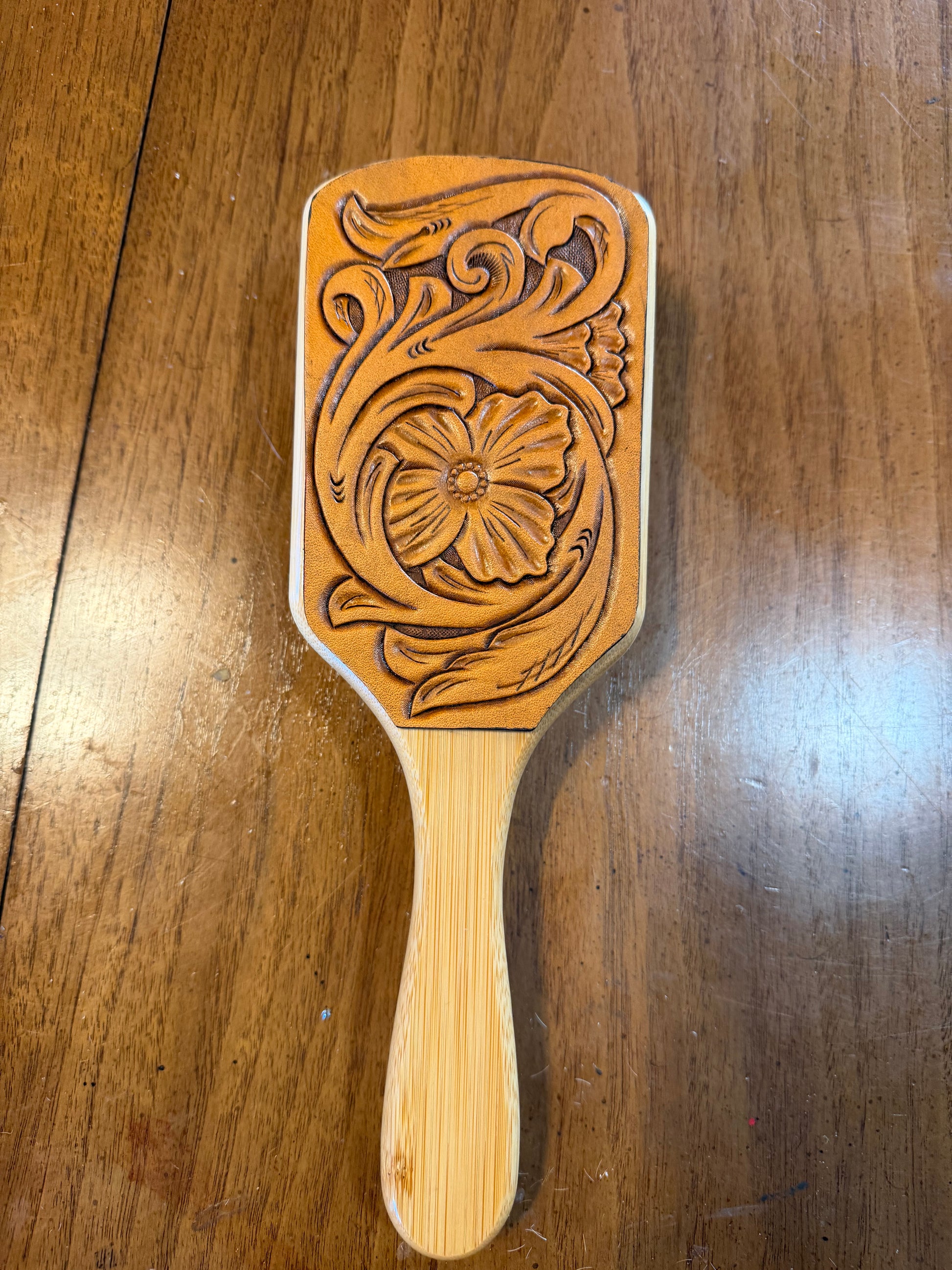 Wooden hairbrush with hand tooled and cowhide patches. Beautiful and useful. Make the perfect gift for someone else or yourself.