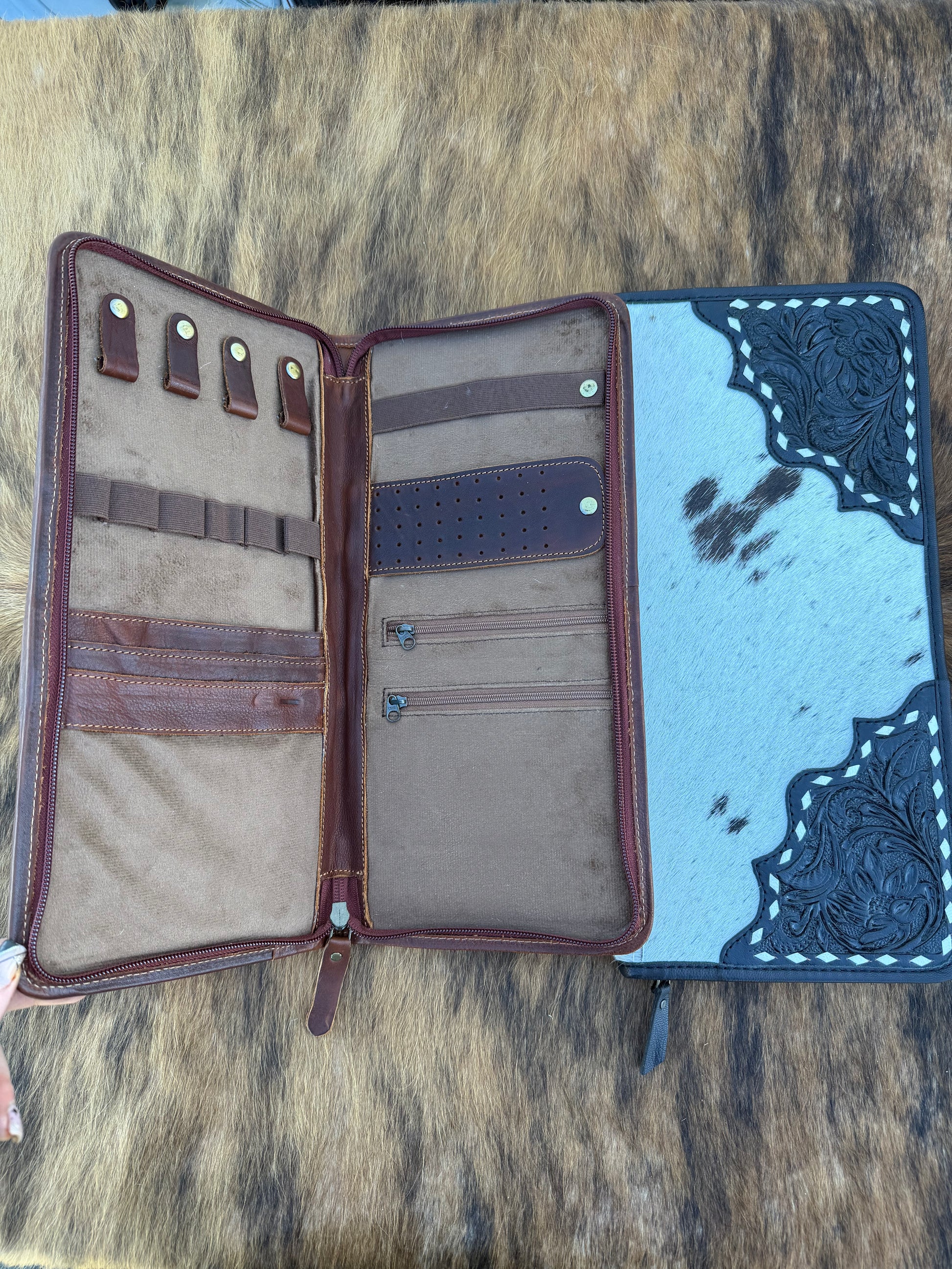 Keep your jewelry organized in style with this handcrafted wallet featuring cowhide and hand-tooled leather accents. Measuring 14” x 7”, it offers plenty of space for necklaces, bracelets, earrings, and more, while showcasing western craftsmanship. Durable, functional, and unique, it’s perfect for travel or at-home organization.