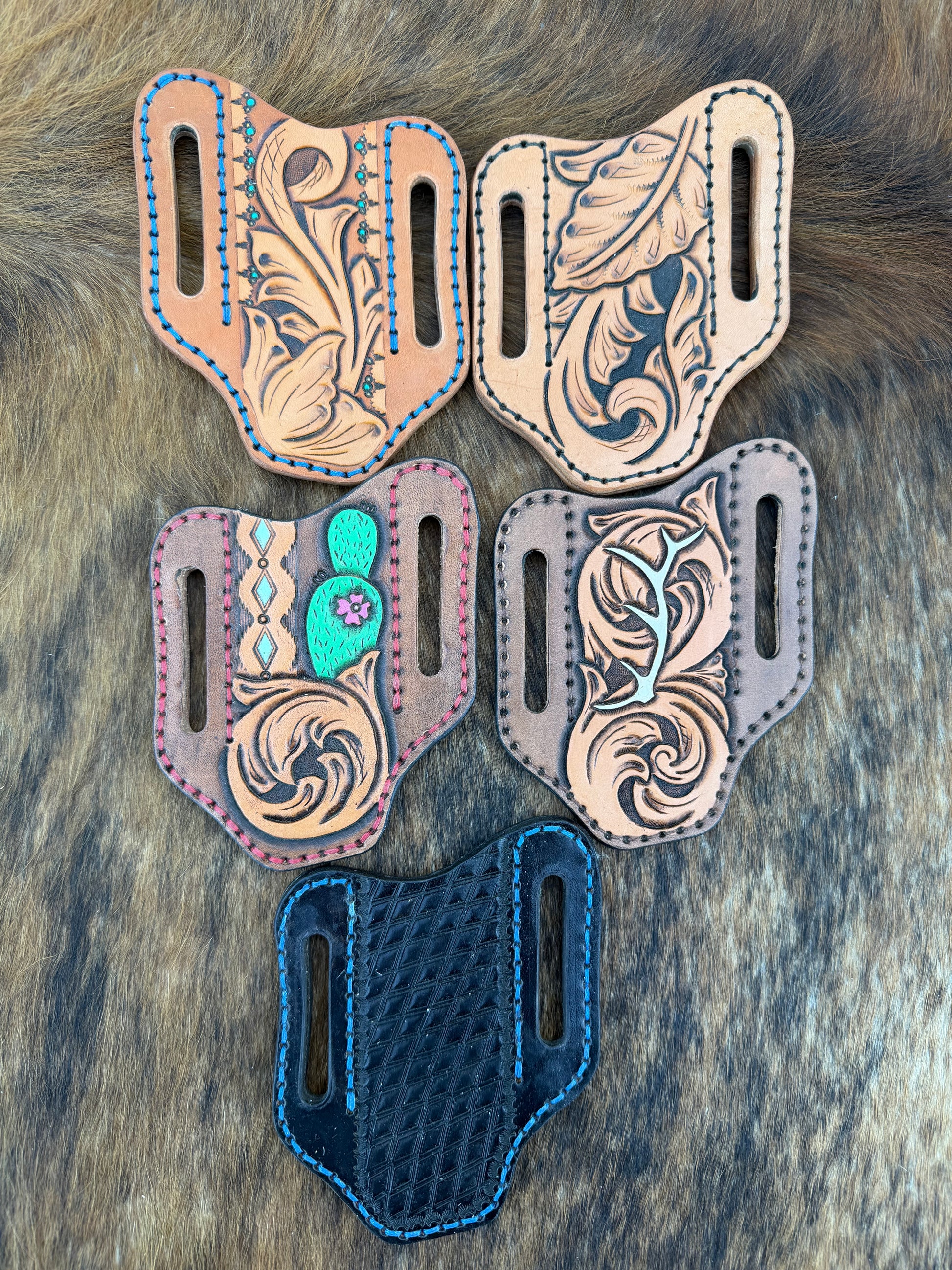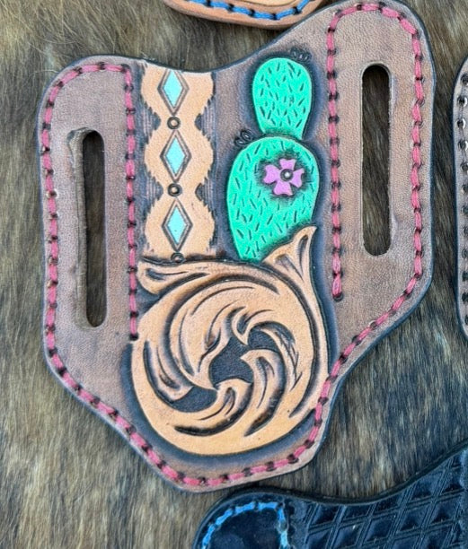 Crafted by hand, these knife sheaths are designed to securely hold a folding knife while wearing on your belt. Each sheath features detailed hand tooling and stamped designs, making every piece unique. Durable and functional, it’s the perfect combination of western craftsmanship and everyday practicality.
