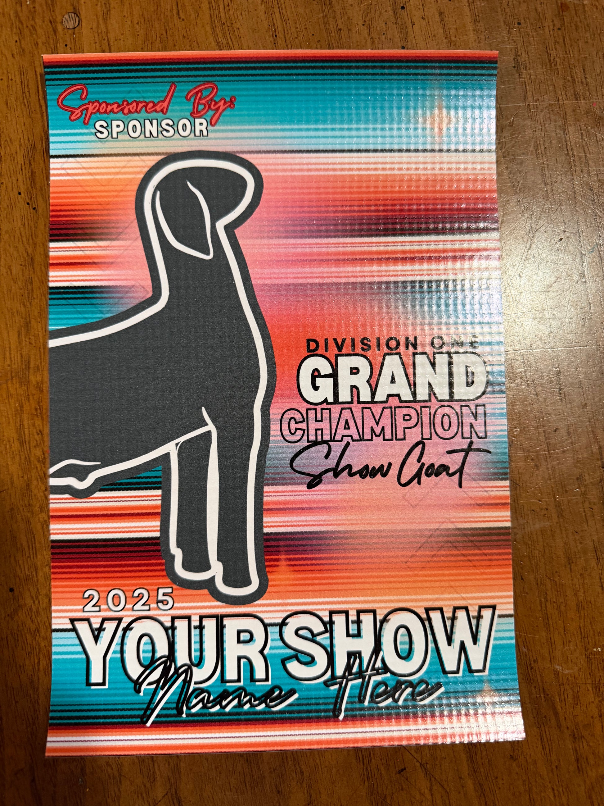 Customization will include name, date, championship title, and livestock image changes as requested. Available livestock figures are steers, heifers, lambs, wether goats, doe goats, rabbits, chickens, and horses. Most colors and wording are editable. I can supply a fillable spreadsheet for large orders.